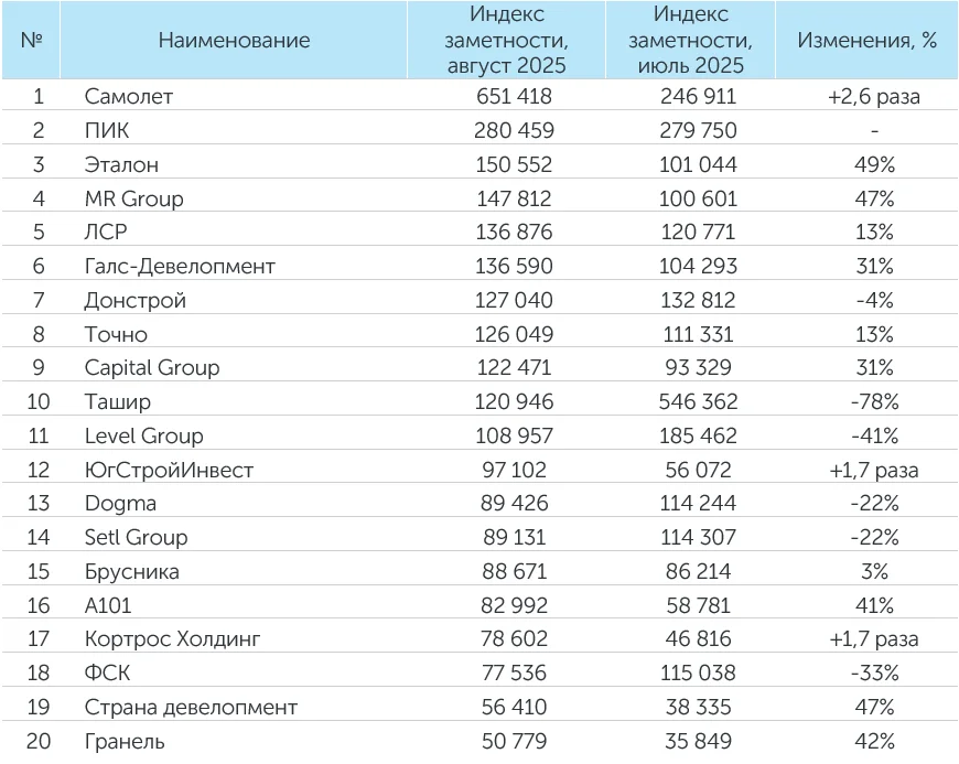 ГК «Самолет» в августе 2025 года заняла второе место по количеству упоминаний, первое место по индексу заметности и охвату аудитории.