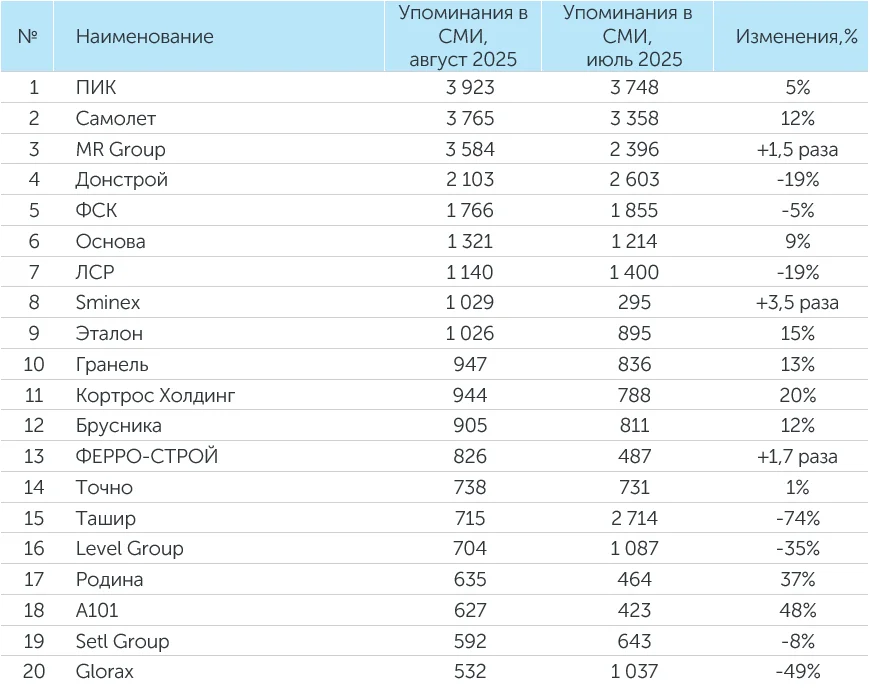 Группа компаний ПИК в августе 2025 г. заняла первое место по количеству упоминаний и второе место по «заметности» в СМИ и охвату аудитории.