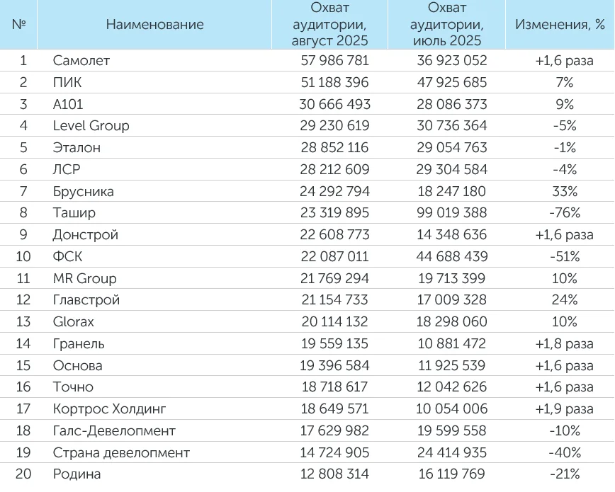 ГК «А101» в августе 2025 года заняла третье место по охвату аудитории.